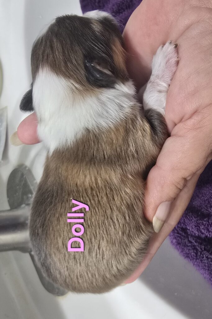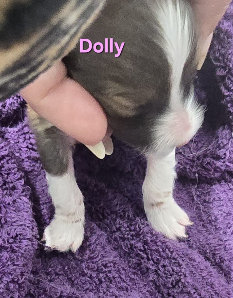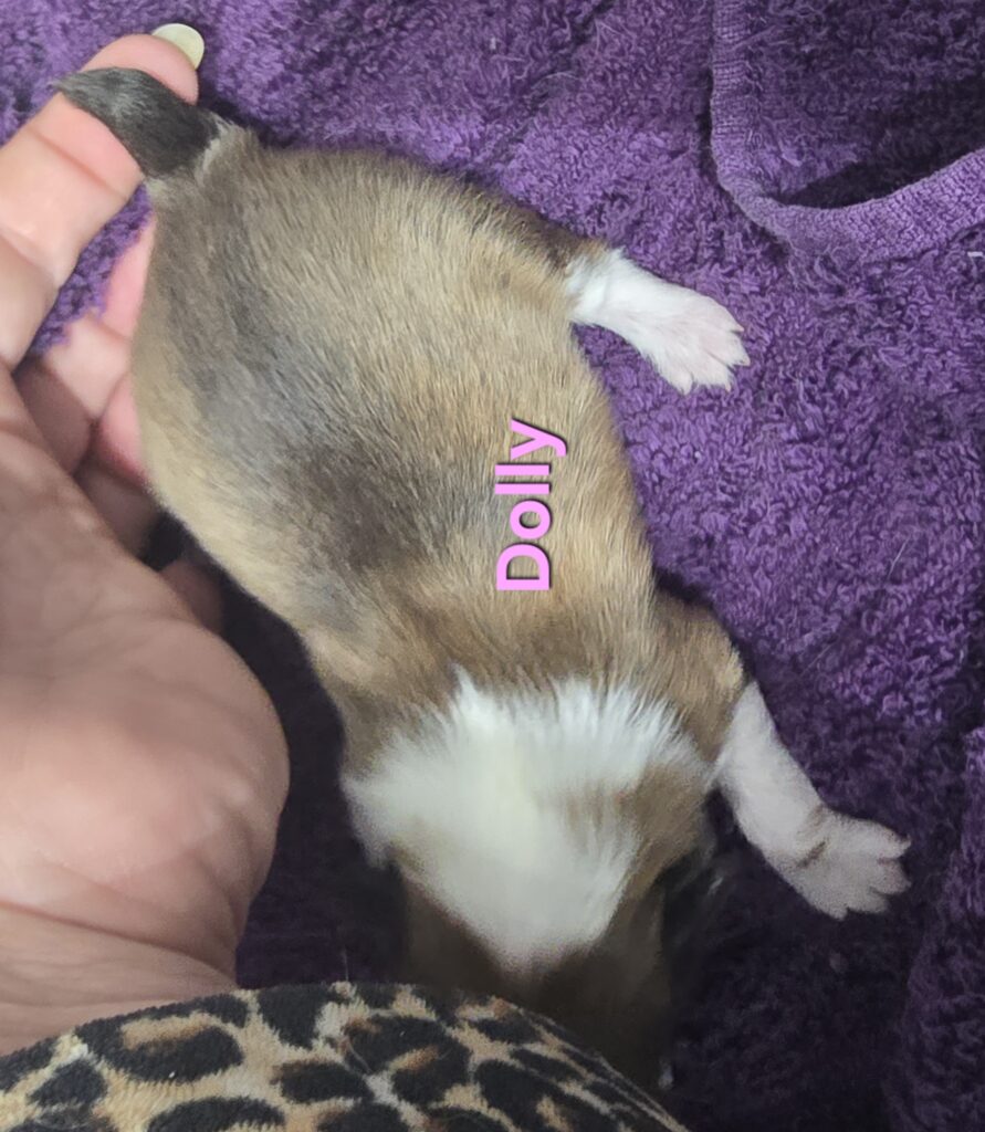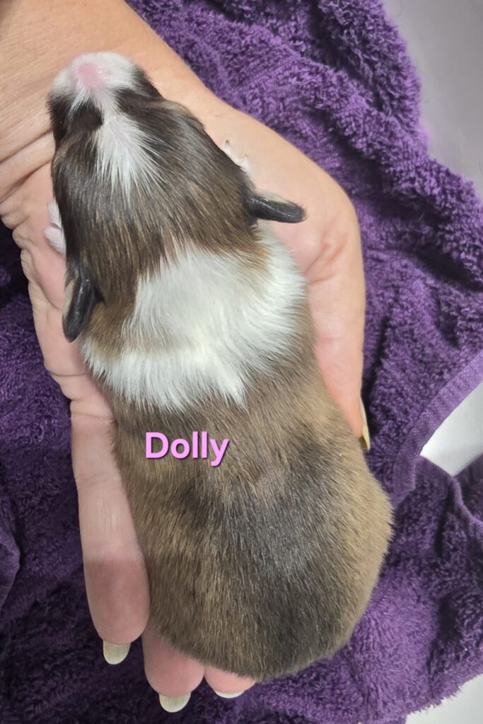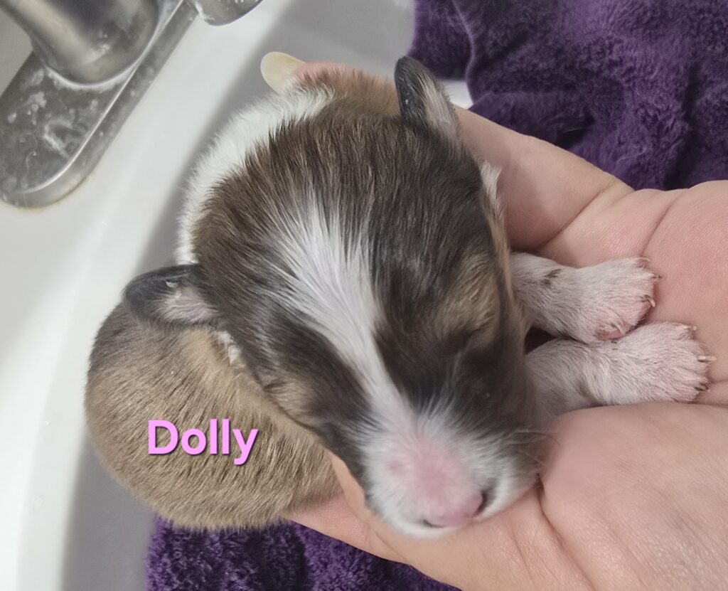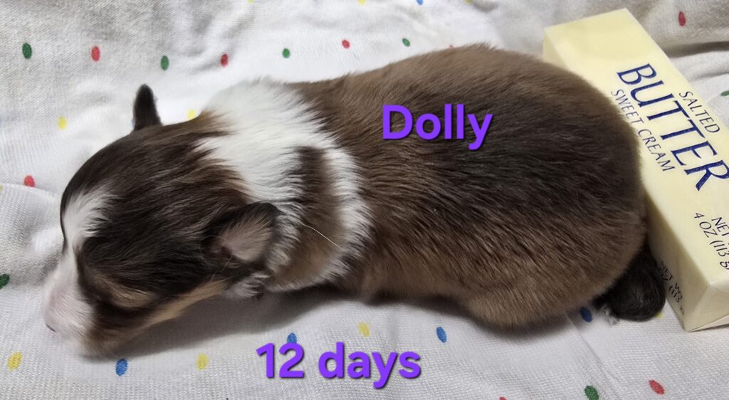 Dolly is a precious, tiny, sable and white girl. Smallest baby in the litter. She has a full white collar, stockings on her front feet, socks on her back. I am unsure if she will keep her blaze. Dolly is priced slightly lower due to having some faults with her tail. She has a bobbed tail that doesn’t have a white tail tip. Bobbed tails are defined as tail length that is above the hocks. It is not a health issue, just a throwback to breeds that went into making the sheltie breed. Her tail appears to be half length but it may appear shorter or longer as she grows. The tail length will not affect her health, it just wont be as long as most shelties.