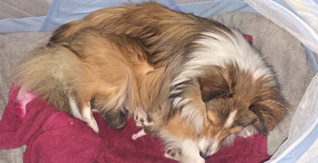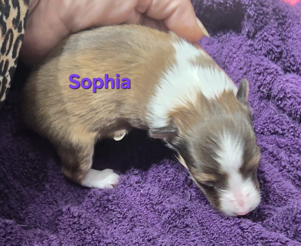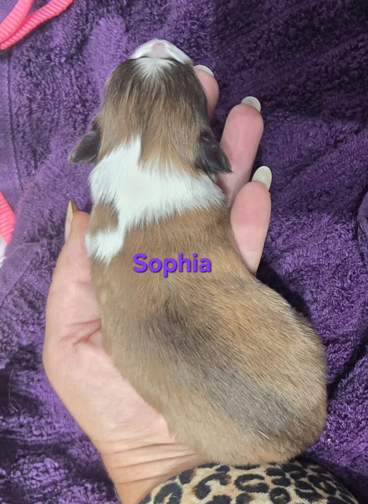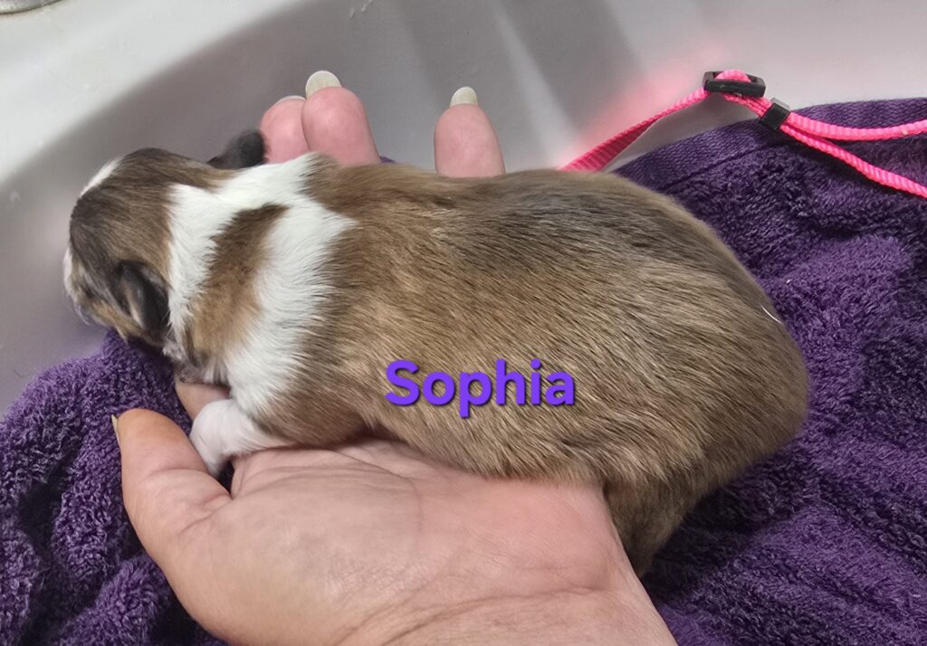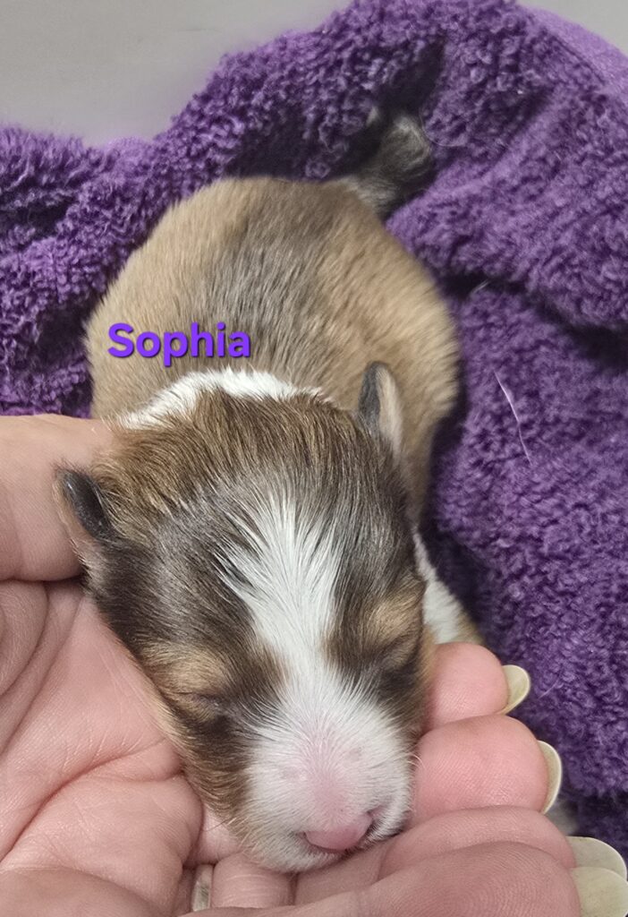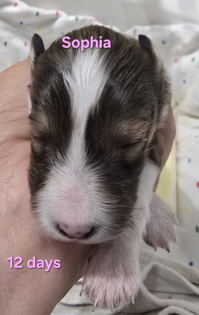 Sofia is a gorgeous little sable and white girl. Her white collar is unbroken with a swish of sable on the left side. She has white stockings on her front legs and white socks on her back feet. She has a nice fat blaze she will probably keep and a white tail tip.